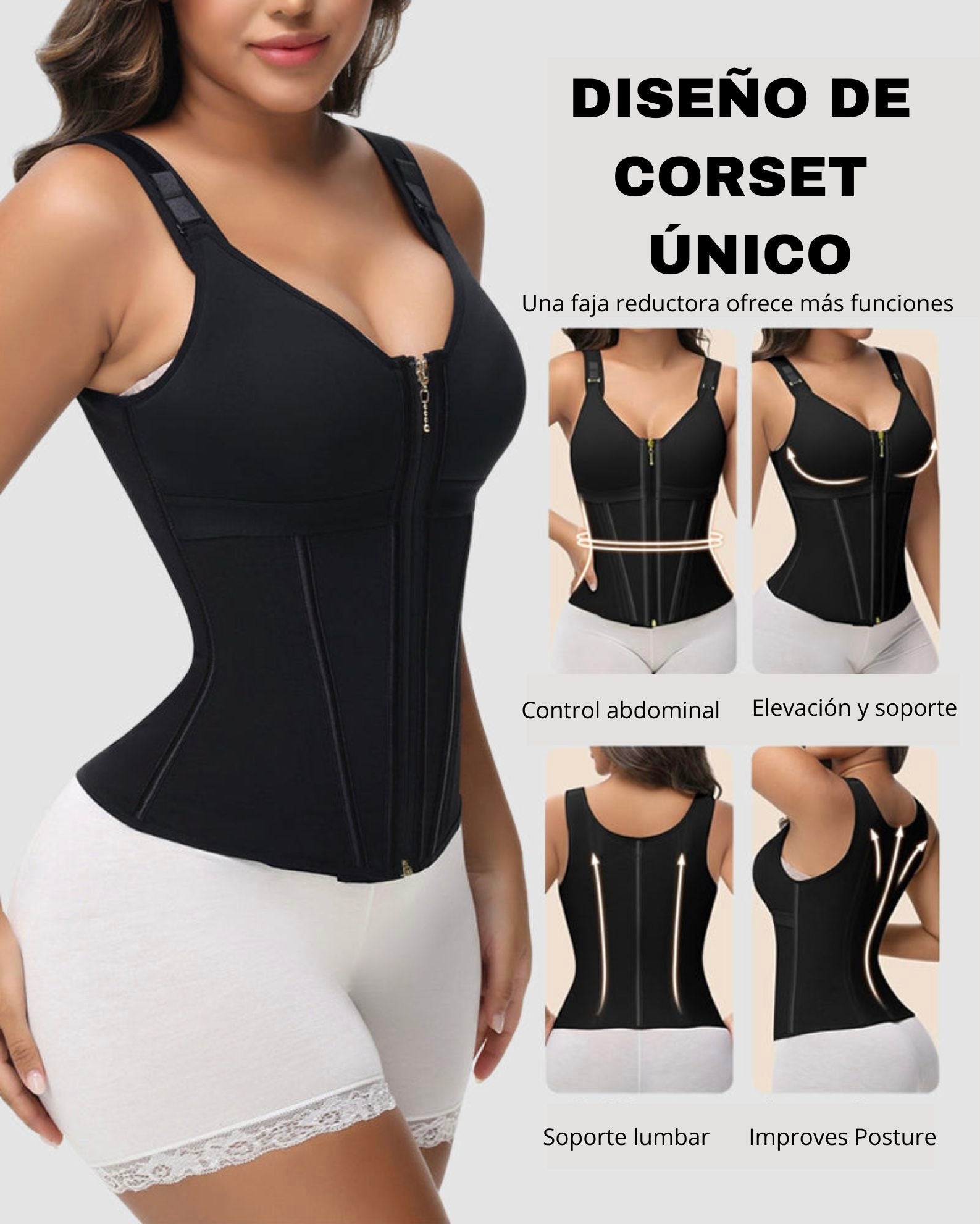 Proporciona soporte firme al abdomen, ayuda a redefinir la silueta y mejora la postura, reduciendo molestias diarias.